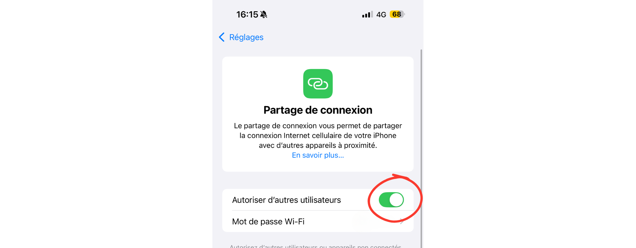 Avant tout, il vous faudra activer le partage de connexion dans vos réglages :